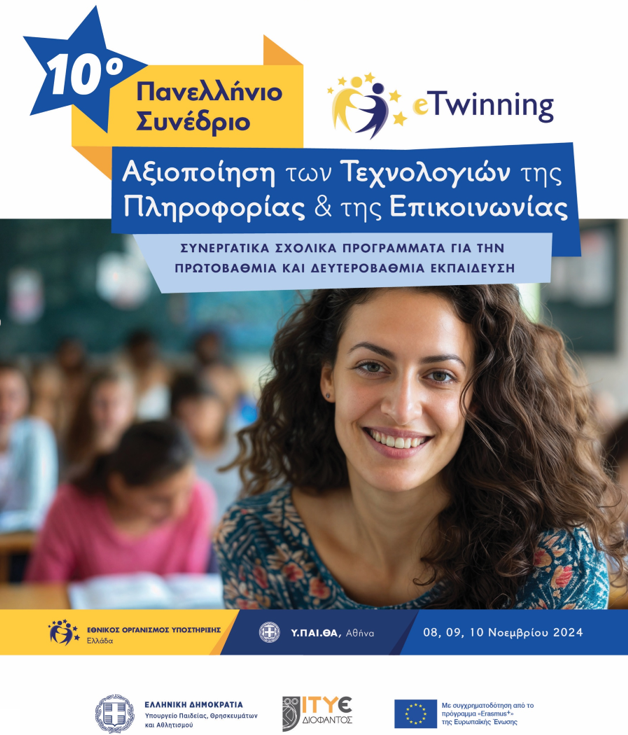 Ολοκληρώθηκαν με επιτυχία οι εργασίες του «1 0ου Πανελλήνιου Συνεδρίου eTwinning», που πραγματοποιήθηκε στην Αθήνα, 08, 09, 10 Νοεμβρίου 2024 και είχε θέμα την «Αξιοποίηση των Τεχνολογιών της Πληροφορίας και της Επικοινωνίας στα συνεργατικά σχολικά προγράμματα στην Πρωτοβάθμια και Δευτεροβάθμια Εκπαίδευση».