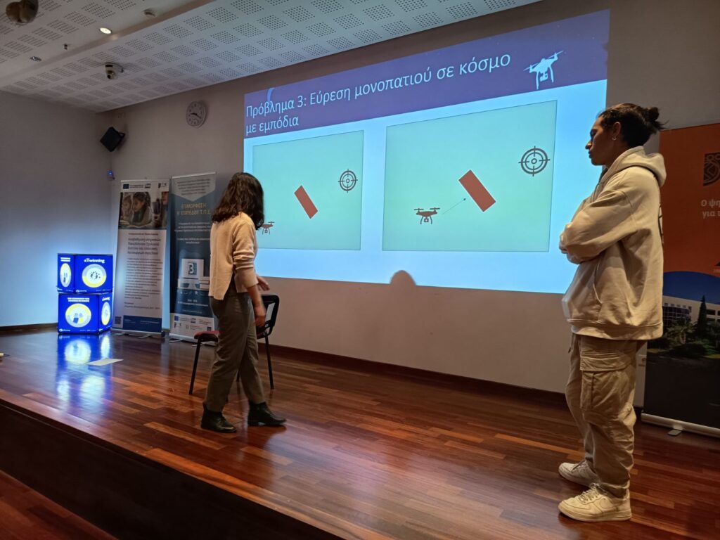 Στη συνέχεια, παρουσιάστηκε η θεματική «Drones & Αλγόριθμοι» από τη Δρ. Νίκη Πατρινοπούλου, η οποία εισήγαγε τους μαθητές στον συναρπαστικό κόσμο των drones και στον ρόλο που διαδραματίζουν οι αλγόριθμοι και ο προγραμματισμός στη λειτουργία και τον έλεγχό τους (αυτόνομη πτήση, πλοήγηση, εκτέλεση σύνθετων αποστολών). Συγκεκριμένα, παρουσιάστηκαν οι βασικές κατηγορίες αλγορίθμων σε drones, οι παράγοντες που τους επηρεάζουν, αλλά και η διασφάλιση του ελέγχου και της αποτελεσματικότητάς τους σε όλους τους τομείς.