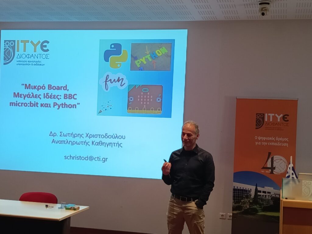 Αμέσως μετά πραγματοποιήθηκε η παρουσίαση «Μικρό Board, Μεγάλες Ιδέες: BBC micro και Python» από τον Αναπληρωτή Καθηγητή κ. Σωτήριο Χριστοδούλου. Οι μαθητές γνώρισαν τις δυνατότητες του μικροελεγκτή BBC micro και είδαν στην πράξη πώς ο προγραμματισμός σε Python μπορεί να χρησιμοποιηθεί για τη δημιουργία καινοτόμων εφαρμογών και μικρών τεχνολογικών έργων.