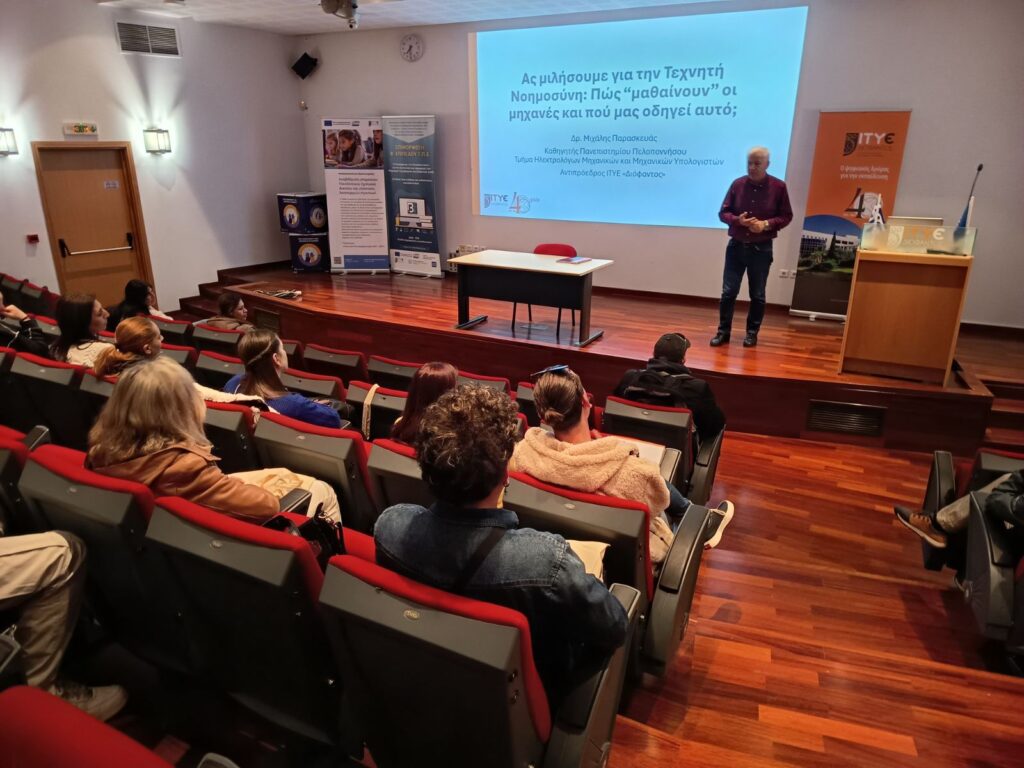 Το πρόγραμμα της επίσκεψης ξεκίνησε με την παρουσίαση «Ας μιλήσουμε για την Τεχνητή Νοημοσύνη: Πώς “μαθαίνουν” οι μηχανές και πού μας οδηγεί αυτό» από τον Καθηγητή και Αντιπρόεδρο του ΙΤΥΕ ΔΙΟΦΑΝΤΟΣ κ. Μιχαήλ Παρασκευά. Οι μαθητές παρακολούθησαν με ιδιαίτερο ενδιαφέρον ένα από τα πιο επίκαιρα επιστημονικά και τεχνολογικά θέματα, όπως είναι αυτό της Τεχνητής Νοημοσύνης, αλλά και τις επιπτώσεις και αλλαγές που επιφέρει στη ζωή τους.