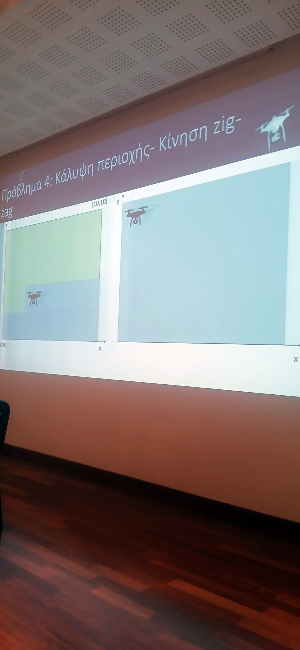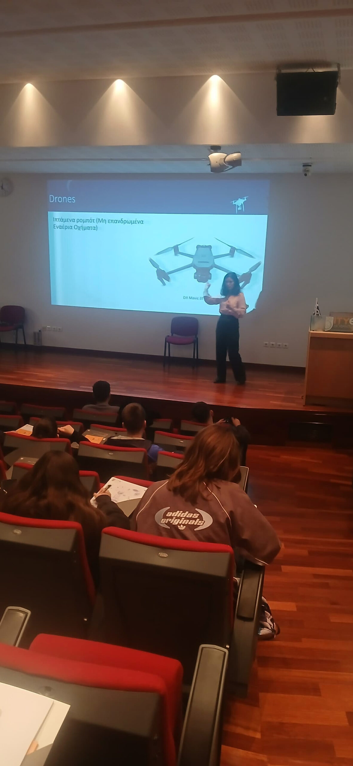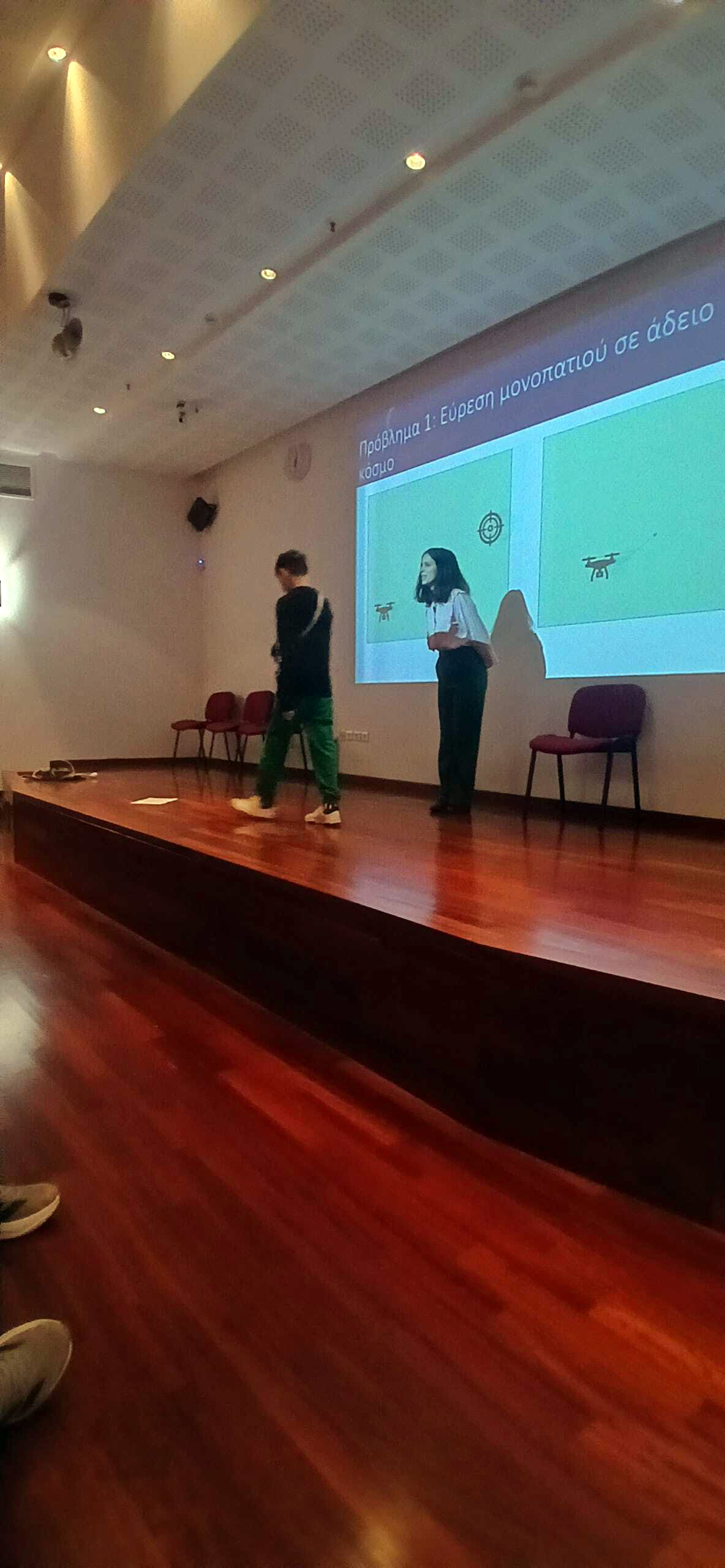 Κατόπιν, οι Δρ. Νίκη Πατρινοπούλου και Ιωάννης Δαραμούσκας παρουσίασαν το εργαστήριο με τίτλο «Drones & Αλγόριθμοι», αναδεικνύοντας τη σημασία των αλγορίθμων στη ρομποτική και τη χρήση τους στον προγραμματισμό drones.