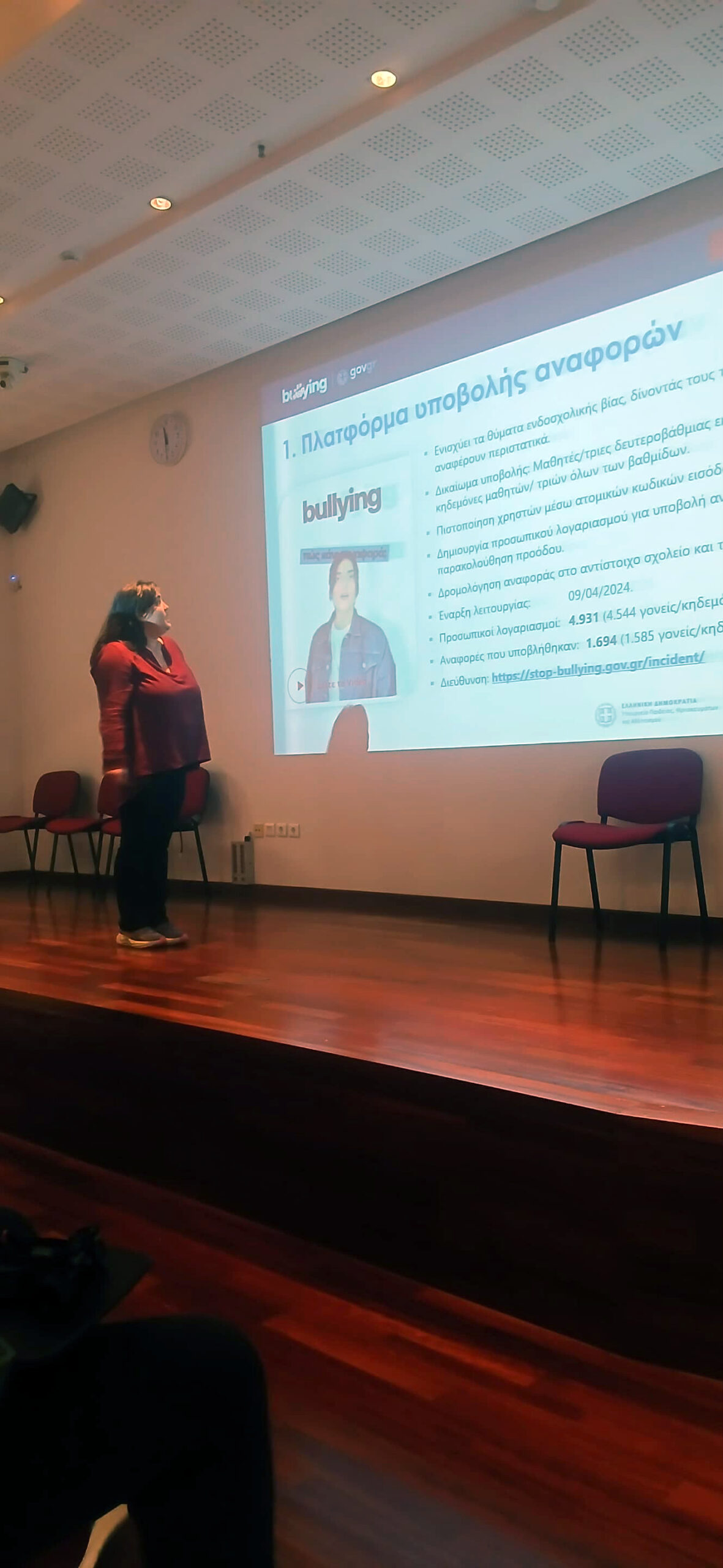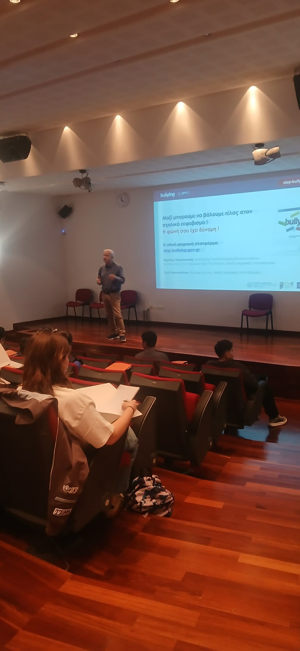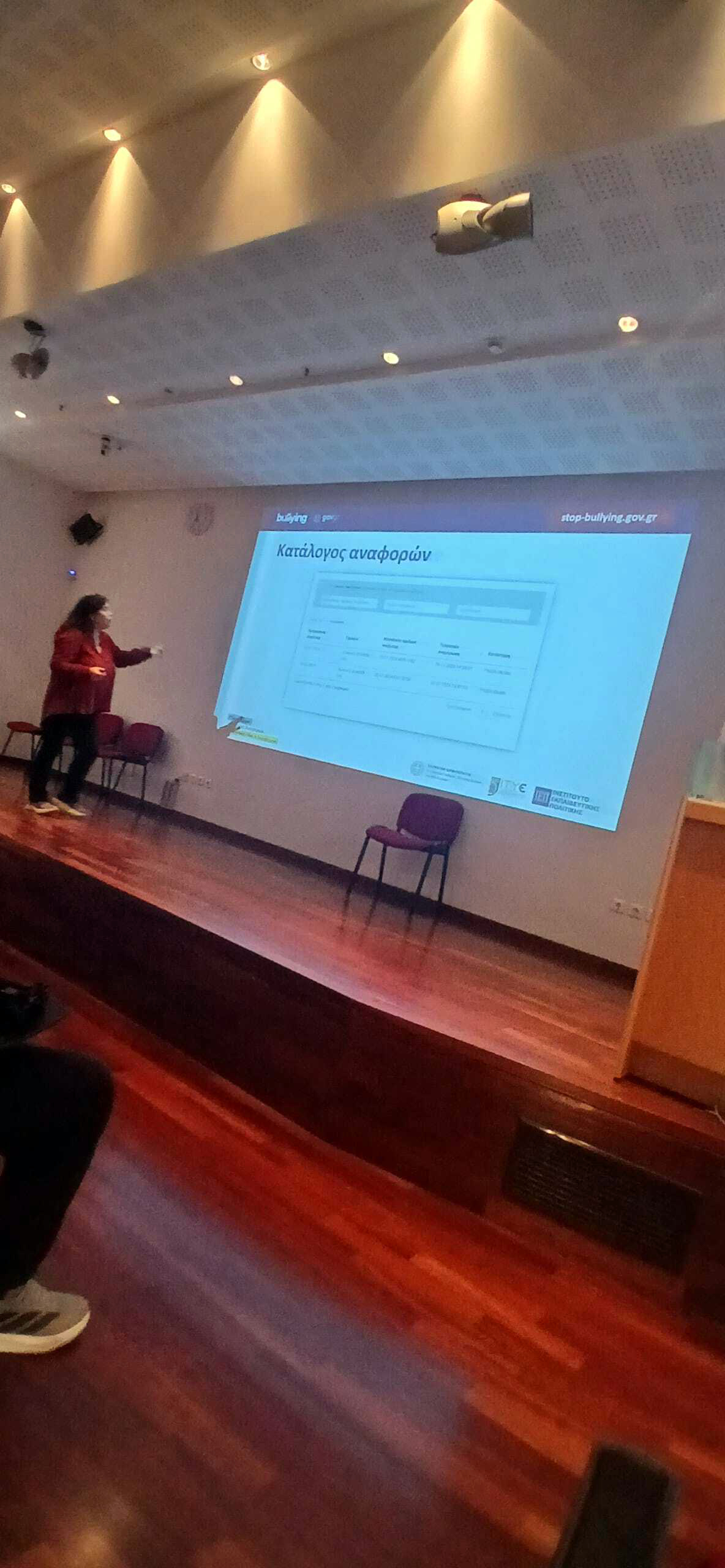 Το πρόγραμμα ξεκίνησε με το καλωσόρισμα του Αντιπρόεδρου του ΙΤΥΕ ΔΙΟΦΑΝΤΟΣ, καθηγητή Μιχαήλ Παρασκευά και στη συνέχεια η κ. Υρώ Λιακοπούλου, προγραμματίστρια και δημιουργός της πλατφόρμας «stop-bullying», ενημέρωσε το μαθητικό κοινό για τον τρόπουποβολής αναφορών για περιστατικά ενδοσχολικής βίας και εκφοβισμού μέσω της ειδικής ψηφιακής πλατφόρμας stop-bullying.gov.gr.