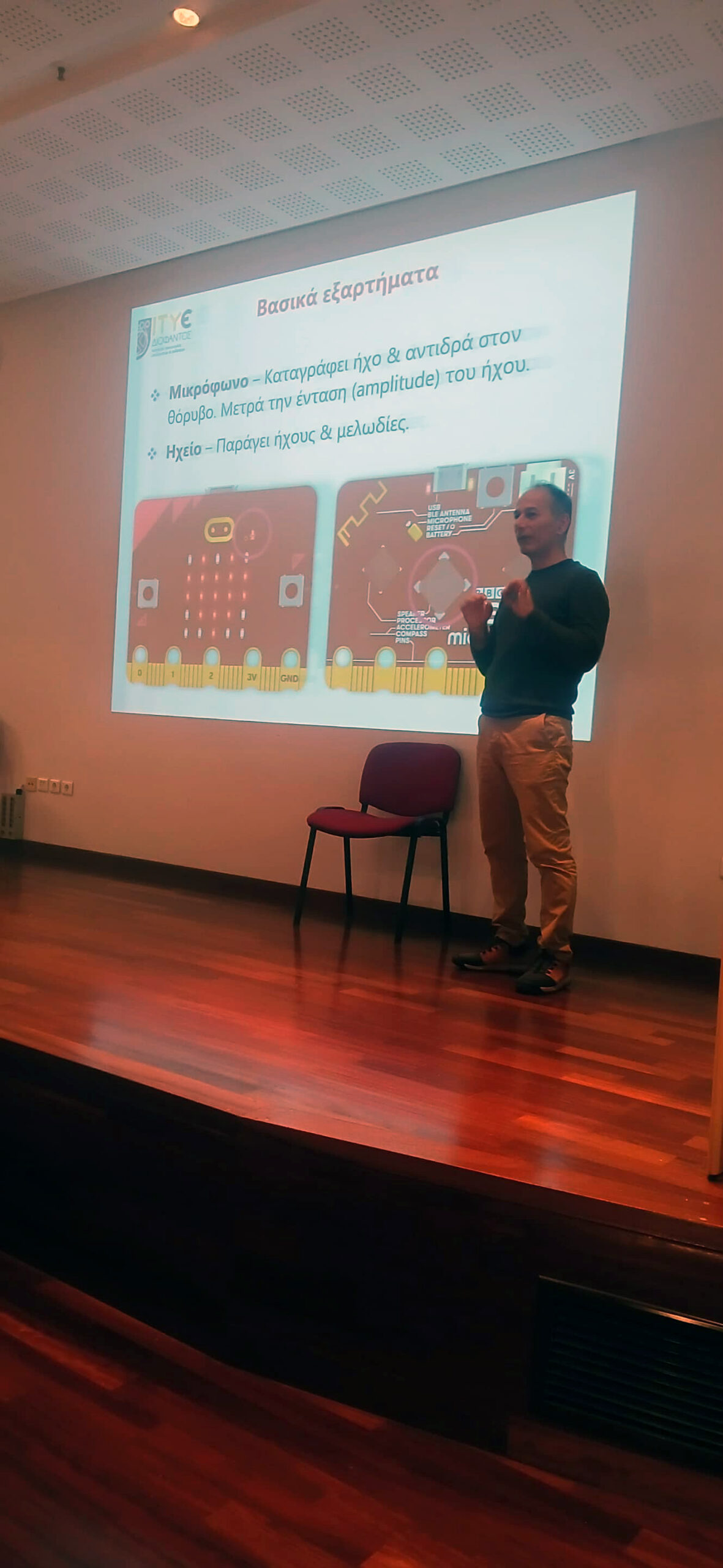 Ακολούθησε παρουσίαση από τον αναπληρωτή καθηγητή κ. Σωτήριο Χριστοδούλου με θέμα «micro:bit και Python», όπου οι μαθητές/μαθήτριες εισήχθησαν στον προγραμματισμό μέσω της χρήσης της πλατφόρμας micro:bit.