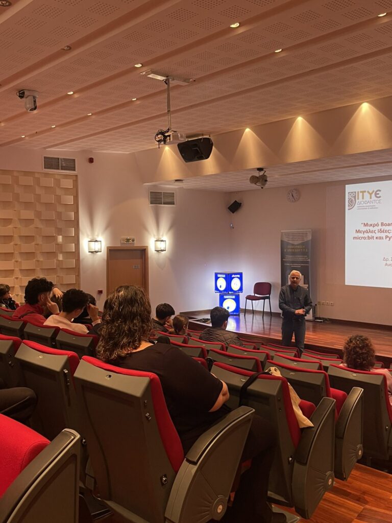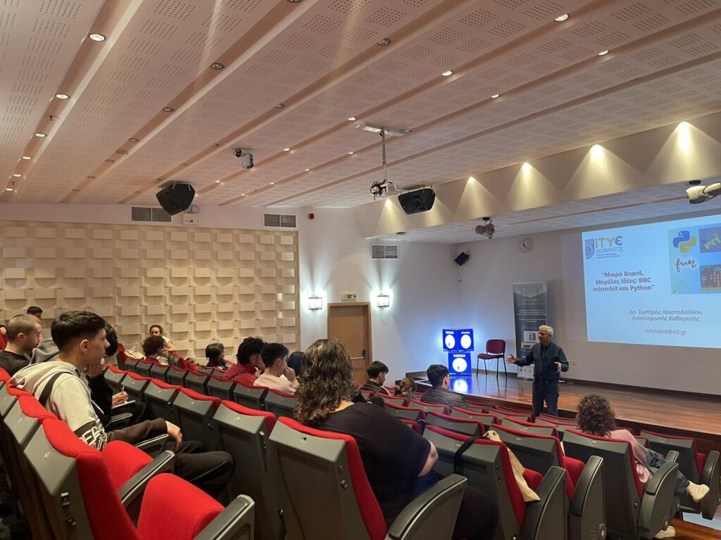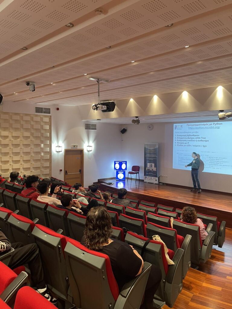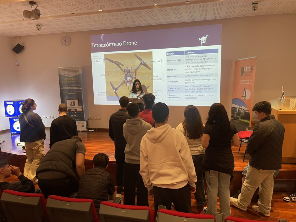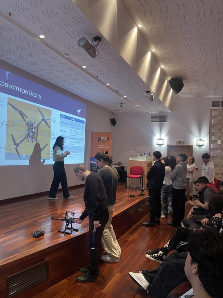 Προηγήθηκε ένα σύντομο καλωσόρισμα των μαθητών και των συνοδών εκπαιδευτικών τους στο αμφιθέατρο του κτιρίου «Δ. Μαρίτσας», ενώ οι μαθητές κατανεμημένοι σε δύο ομάδες, παρακολούθησαν το πρόγραμμα θεωρητικής κατάρτισης για τα Drones και τους αλγόριθμους από την Νίκη Πατρινοπούλου που τους βοήθησε σημαντικά να κατανοήσουν τον τρόπο λειτουργίας των μη επανδρωμένων αεροσκαφών. Νωρίτερα, οι μαθητές είχαν την ευκαιρία να ανακαλύψουν τον μικρό, αλλά εξαιρετικά ισχυρό μικροελεγκτή BBC micro:bit από τον αν. Καθηγητή Σωτήρη Χριστοδούλου, όπου μέσα από ένα διαδραστικό project έμαθαν για τις βασικές έννοιες προγραμματισμού, αλλά και για εφαρμογές που συνδέονται με την καθημερινότητά μας, από απλά παιχνίδια μέχρι έξυπνες συσκευές και αυτοματισμούς.